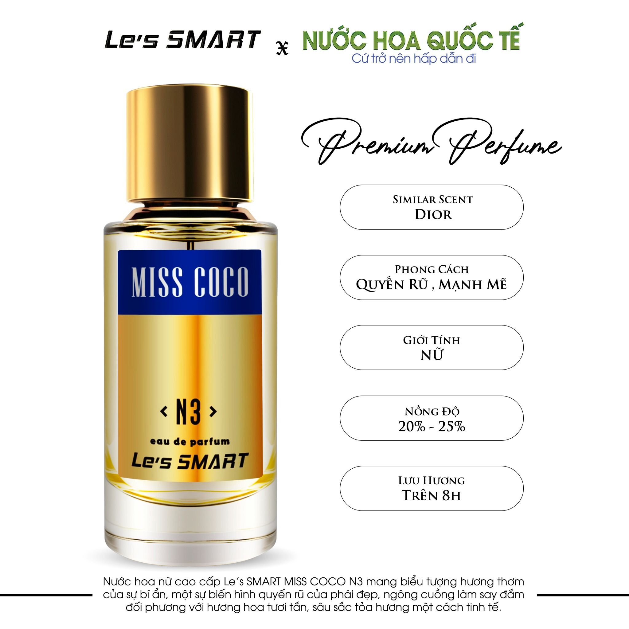 Nước Hoa Quốc Tế xin hân hạnh giới thiệu đến quý bạn sản phẩm Nước hoa nữ cao cấp Le's SMART MISS COCO N3 50ml (hương tương tự Dior) thơm lâu trên 8 tiếng - Hương Thơm Quyến Rũ, Mạnh Mẽ - dung tích 50ml
